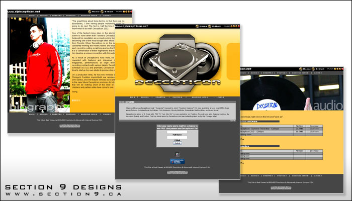 Decepticon was a Toronto area funky techno DJ, and wanted a site that was slick and vibrant. He wanted the site to be a place where visitors could learn more about himself and his career, view his picture gallery, download mixes and view his monthly top 10 lists. He has since changed his name to Matt Dublin and has a residence on internet an internet radio station.