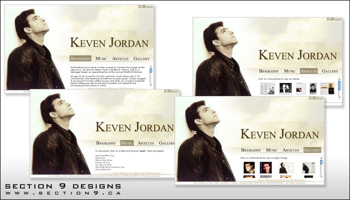 Juno Award winner, Keven Jordan, now working as a freelance graphic designer, commisioned a small web site to showcase some of his music, photos and press releases. The look of the site was based on the cover of his album "No Sign of rain".