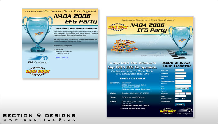E3 Consulting, a web development firm based in Toronto, commissioned Section 9 Designs to design a form submission page for one of their clients, where their employees could enter their information and an access code to RSVP for an event. The design for this page was based on a print ad. Header graphic was animated and done in flash, with looping audio that could be toggled off and on.